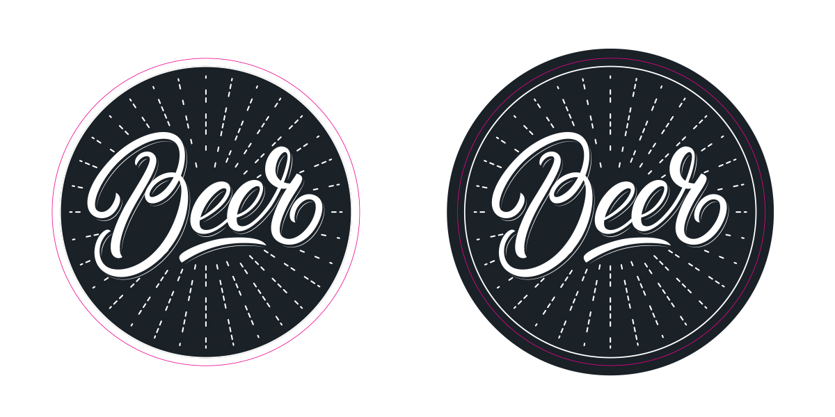 두 번째로 배면 인쇄물 부착을 위한 파일 만드는 방법입니다. 배면 직접 인쇄와 마찬가지로 사이즈와 모양을 결정한 후 일러스트에서 칼선 데이터를 만듭니다. 이때 커팅에 필요한 칼선 레이어와 인쇄가 되는 인쇄 레이어를 아래 예시와 같이 나눠서 작업하여야 하며 직접 인쇄와 반대로 부착을 위한 인쇄 영역은 항상 커팅라인 보다 바깥으로 5mm 나와 있어야 합니다.