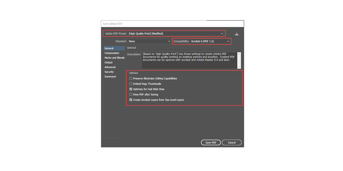 이제 마지막으로 파일을 저장하는 방법을 소개해드리겠습니다. 아크릴 코스터를 제작하는 업체마다 접수하는 파일 형태가 다르지만 대부분 ai 혹은 pdf로 파일을 접수받습니다. 먼저 ai로 파일을 접수할 경우 인쇄면에 글자가 있다면 글자들을 모두 선택하여 아우트라인 처리해야 합니다. 그리고 저장 설정에서 하위 버전에서도 파일을 열 수 있도록 버전을 CS로 설정한 후 ai 파일로 저장합니다. pdf파일로 저장할 때에는 아래의 예시처럼 해당 체크박스를 모두 체크하고 저장해야 합니다.