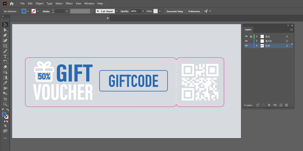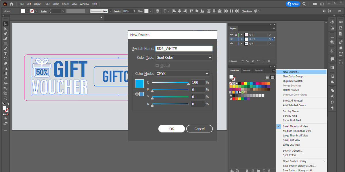 일러스트에서 화이트 인쇄를 하거나 금박, 은박을 위한 별색을 만드는 방법은 아래 예시를 보시면서 따라 하시면 됩니다.